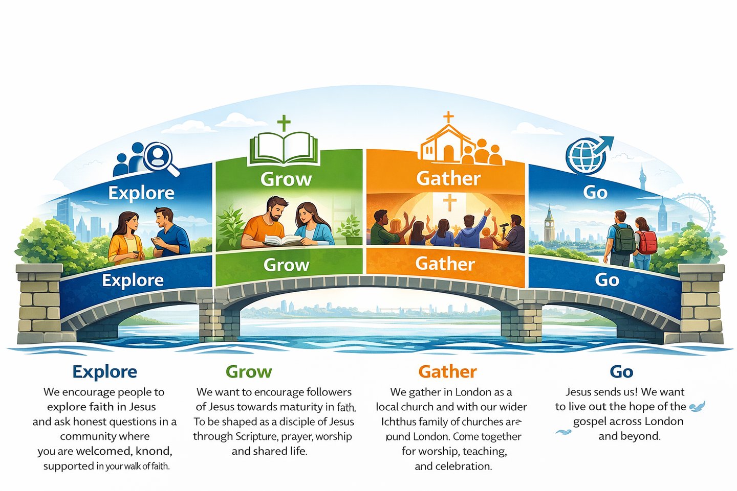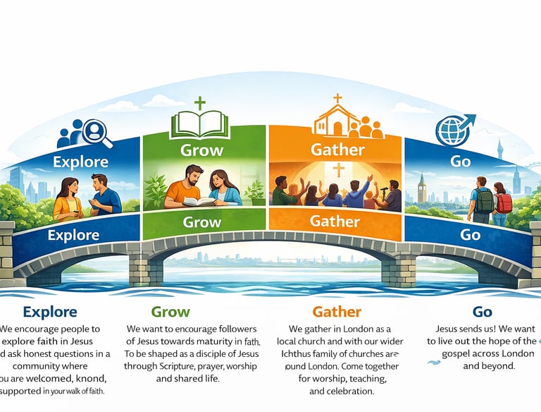 The Bridge Journey (below) shows how people can grow in faith at Ichthus Tower Bridge. For some it begins by exploring faith in Jesus,
